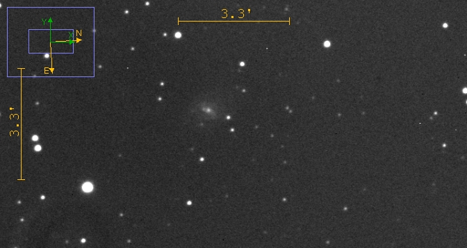 Claramente vemos la supernova en justo bajo la galaxia UGC 3122, algo a la derecha. Mis mediciones dan una magnitud de 16.0.